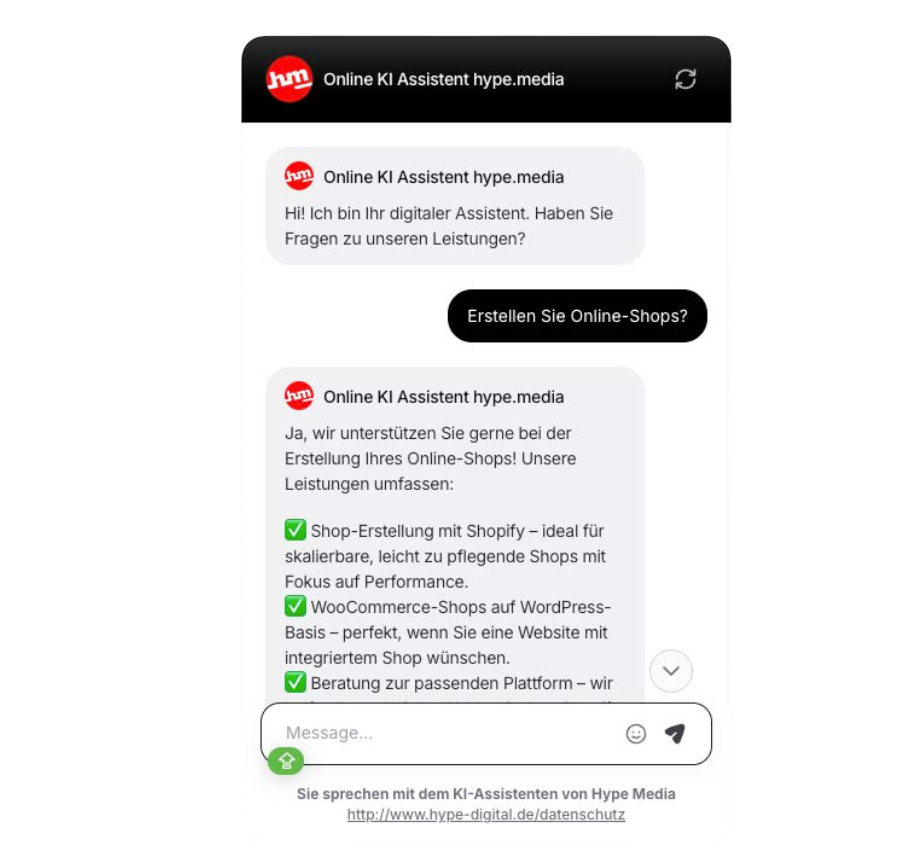 Mit dem hype.media Chatbot-Service optimieren Sie Ihren Kundenservice nachhaltig. Der Chatbot beantwortet häufige Fragen Ihrer Website-Besucher in Echtzeit – schnell, präzise und rund um die Uhr.
