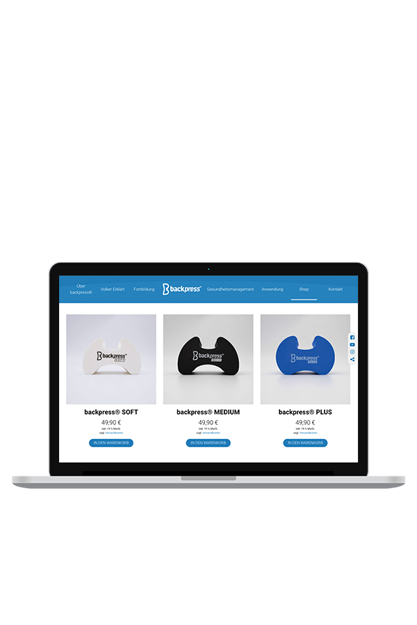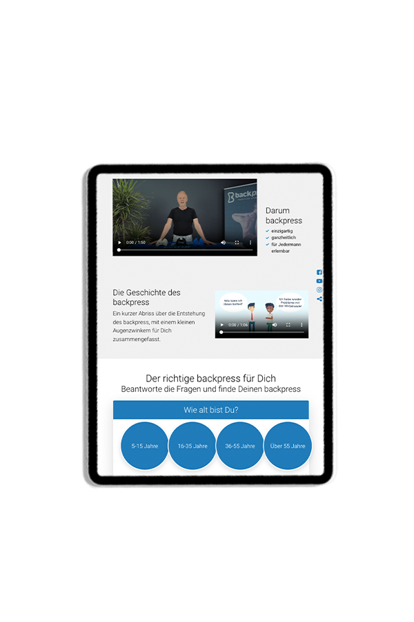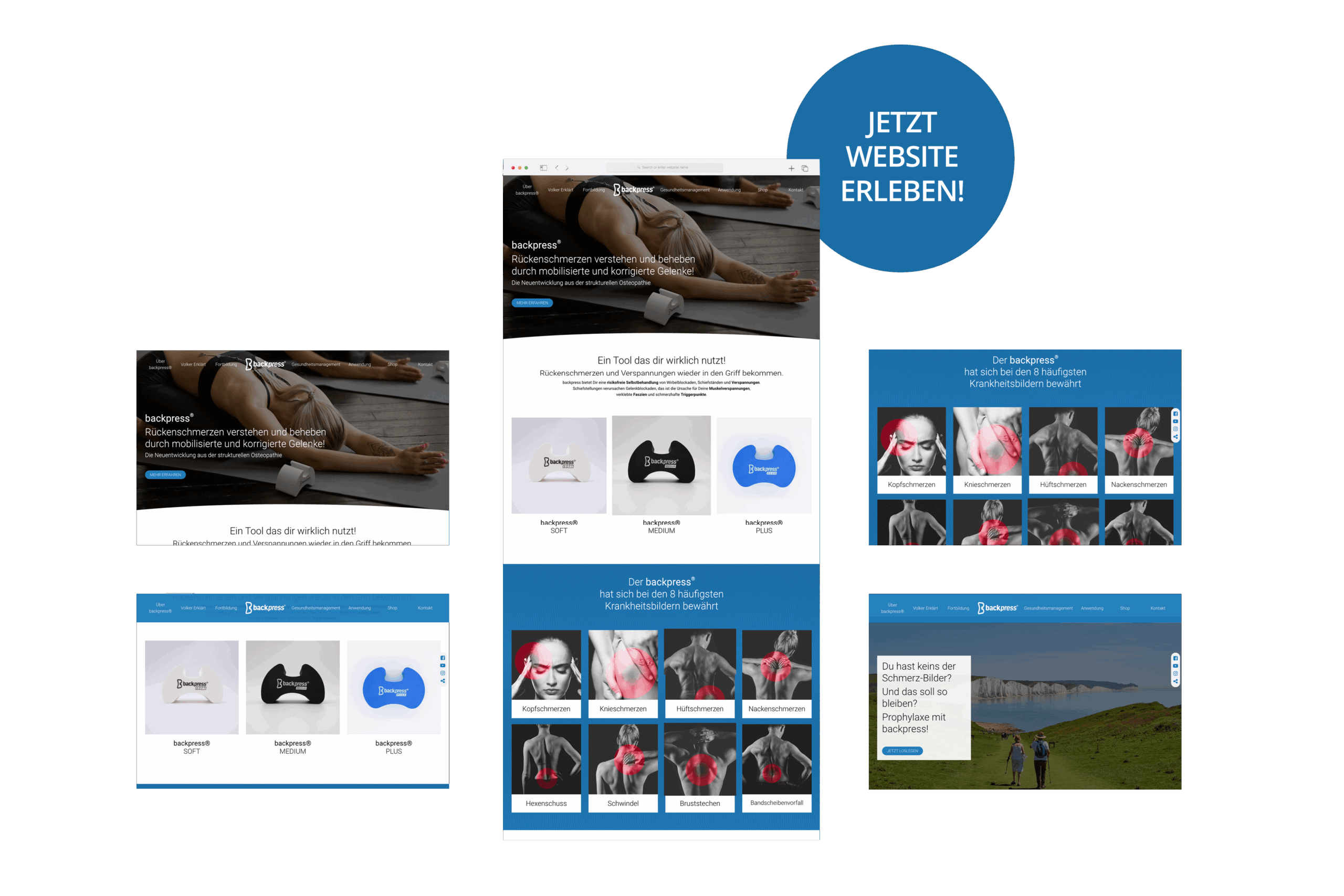 Für unseren Kunden Backpress, einen Anbieter innovativer Produkte zur Selbstbehandlung bei Rückenschmerzen und muskulären Verspannungen, durften wir ein umfassendes Kommunikationspaket realisieren – von klassischen Printmedien bis hin zur kompletten digitalen Markenpräsenz. Ziel war es, die medizinisch-funktionale Kompetenz der Marke mit einer modernen, vertrauenswürdigen und konsistenten Außendarstellung zu verbinden. Mit einer klaren Designstrategie und präziser technischer Umsetzung sorgen wir dafür, dass Marken wie Backpress auf allen Kanälen professionell und zukunftsorientiert wahrgenommen werden.