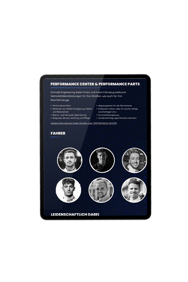 Im Rahmen einer umfassenden digitalen Partnerschaft verantworten wir als Lead-Agentur das vollständige digitale Marketing für die Schnabl Engineering sowie deren verbundene Marken – den firmeneigenen Rennstall und das Sportwagen Performance Center mit Sitz in Mittelhessen. Unser Mandat umfasst die strategische Planung, technische Umsetzung und kontinuierliche Weiterentwicklung sämtlicher digitaler Kommunikations- und Vertriebskanäle.