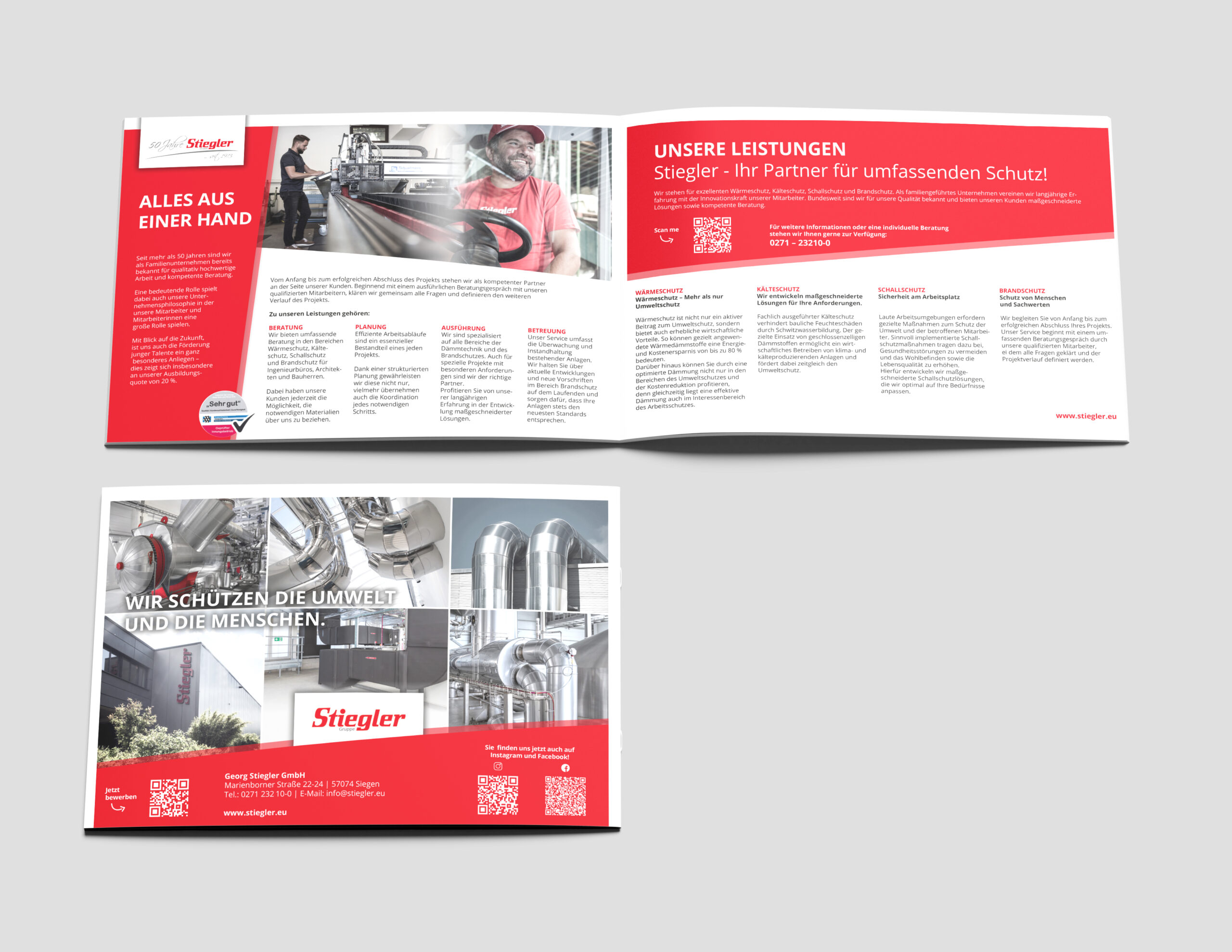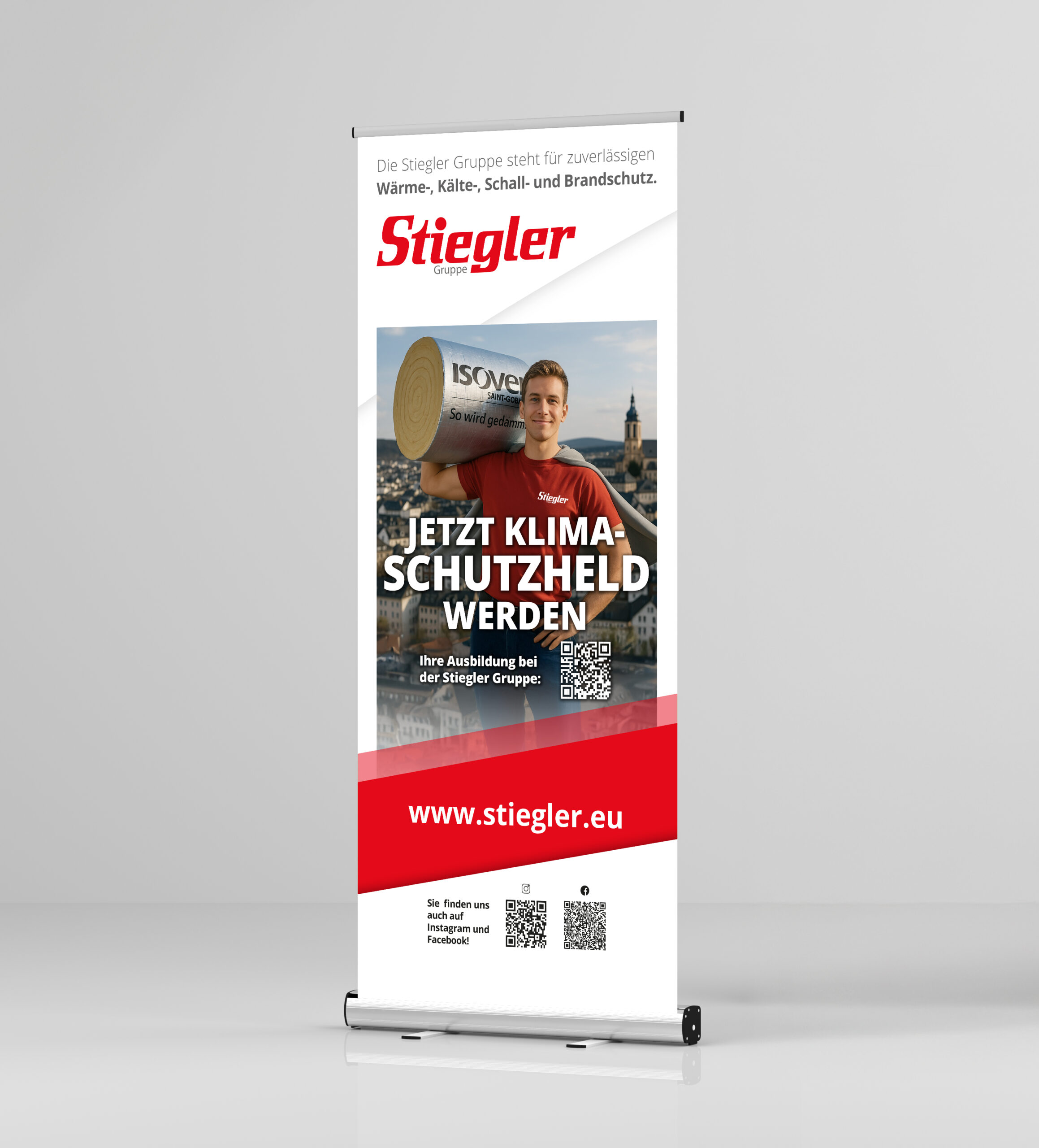 Im Printbereich gestalteten wir eine Vielzahl an zielgerichteten Werbe- und Informationsmedien. Dazu zählen ein Imagefolder, Einleger, Aufkleber, Plakate, Beachflags und Roll-ups – alle umgesetzt im einheitlichen Corporate Design der Stiegler Gruppe. Die Materialien sind sowohl für interne Anwendungen als auch für Messen, Kundenkontakte und Außenauftritte konzipiert. Die Gestaltung folgt einer klaren visuellen Linie und transportiert die Markenwerte zuverlässig, professionell und wiedererkennbar.